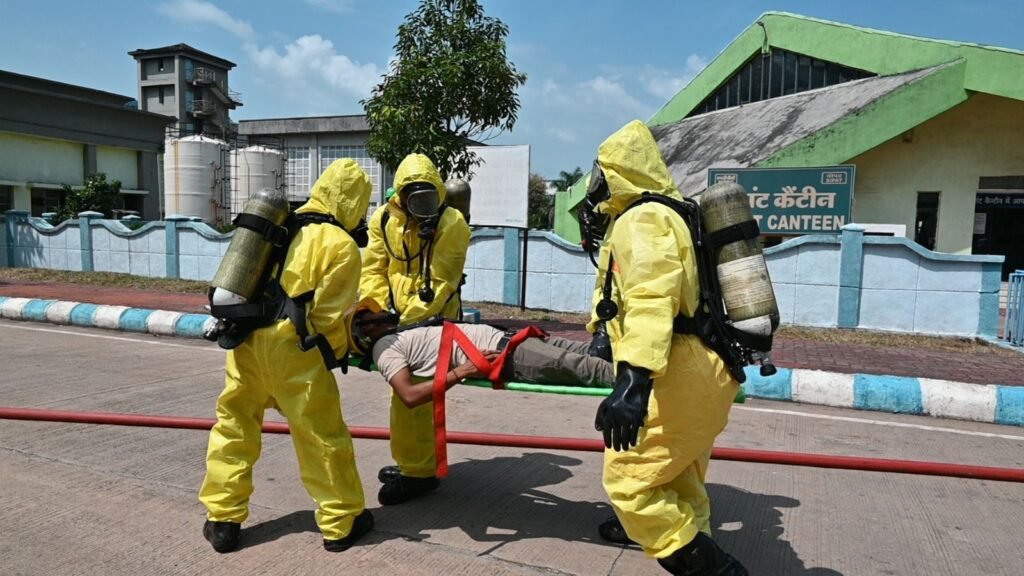 अभ्यास के दौरान, क्लोरीन गैस के संपर्क से प्रभावित व्यक्तियों की सुरक्षा और बचाव के लिए प्रभावी प्रक्रियाओं का प्रदर्शन किया गया।