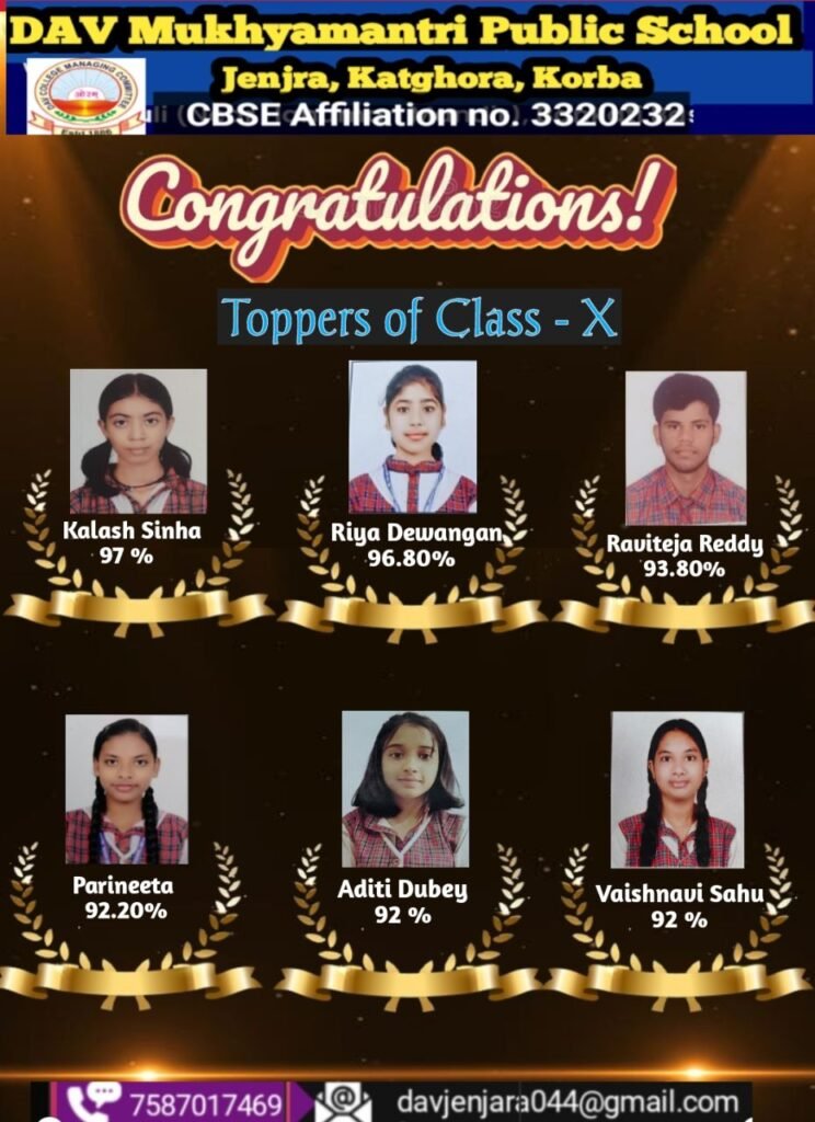 कटघोरा,डी.ए.वी. मुख्यमंत्री पब्लिक स्कूल, जेंजरा ने कक्षा 10वीं के बोर्ड परीक्षा परिणाम में शानदार प्रदर्शन करते हुए एक बार फिर अपनी शैक्षणिक गुणवत्ता का लोहा मनवाया है। विद्यार्थियों के उत्कृष्ट प्रदर्शन से विद्यालय परिसर ही नहीं, बल्कि पूरे क्षेत्र में खुशी और गर्व का माहौल व्याप्त है।