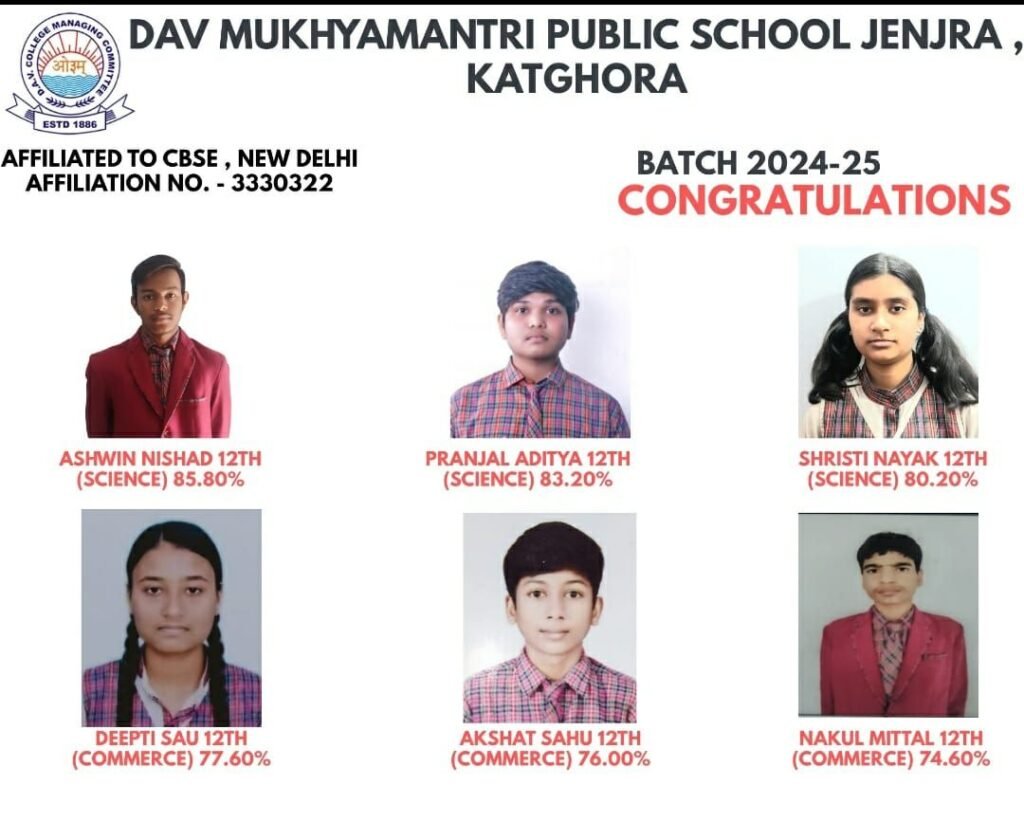 कटघोरा, केंद्रीय माध्यमिक शिक्षा बोर्ड( सीबीएसई ) ने 10वीं एवं 12वीं का परीक्षा परिणाम 13 मई 2025 को घोषित किया l इसमें डी. ए. वी मुख्यमंत्री पब्लिक स्कूल जेंजरा के कक्षा दसवीं एवं बारहवीं (विज्ञान एवं वाणिज्य संकाय )में अध्यनरत विद्यार्थियों का परीक्षा परिणाम उत्कृष्ट रहा l