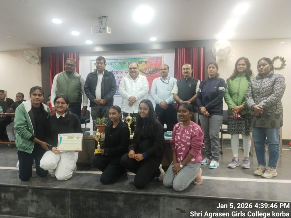 इस प्रतियोगिता में श्री अग्रसेन कन्या महाविद्यालय की महिला शतरंज टीम मे कु श्रुति.कु भारती. कु आयुषी. कु जसप्रीत. कु खुशी. ने उपविजेता का स्थान प्राप्त किया महाविद्यालय की एक छात्रा कु जसप्रीत का चयन राज्य स्तरीय शतरंज (महिला पुरुष) प्रतियोगिता जो की महतं लक्ष्मी नारायण दास महाविद्यालय रायपुर में 21 /1/ 26 से 22/ 1 /26 तक आयोजित होनी है इस अवसर पर महाविद्यालय शिक्षण समिति के अध्यक्ष सुनील जैन एवं श्री अग्रसेन पब्लिक स्कूल के अध्यक्ष सी ए अखिलेश अग्रवाल महाविद्यालय के प्राचार्य डॉ मनोज कुमार झा ने चयनीत छात्रा को आगामी प्रतियोगिता के लिए शुभकामनाएं दी।