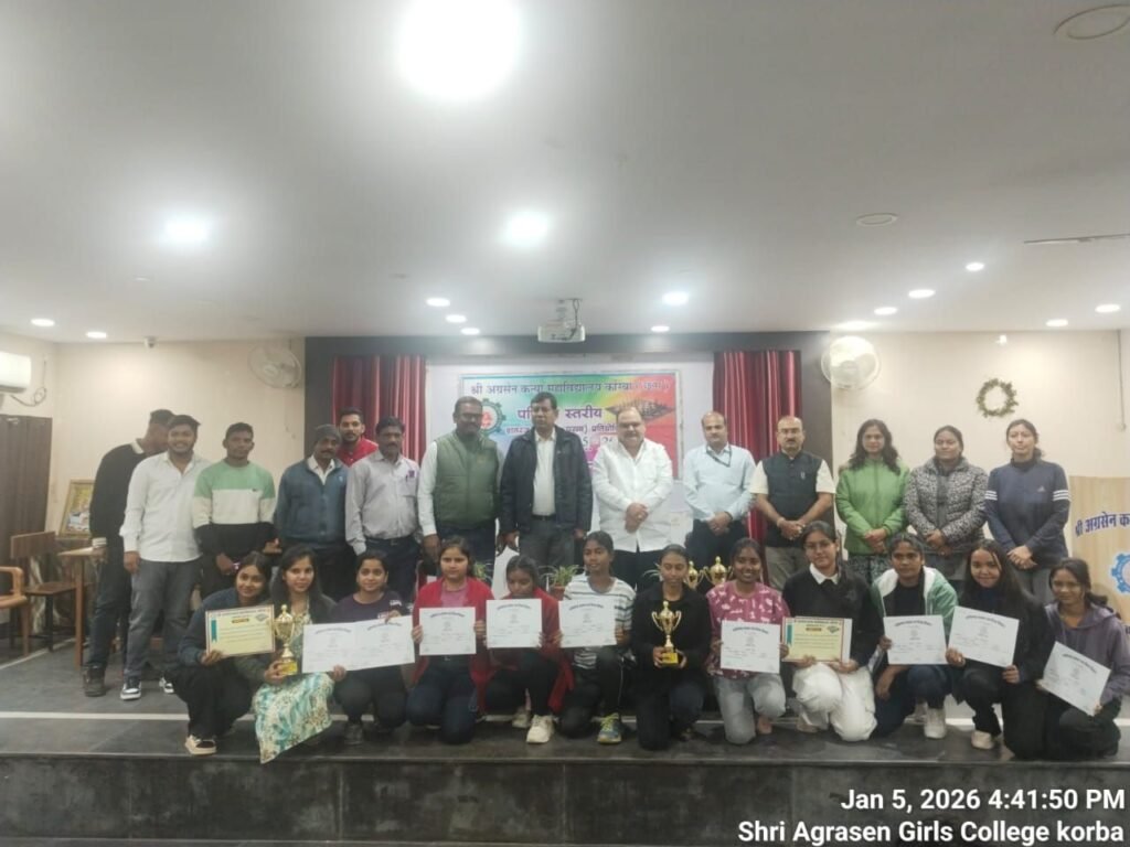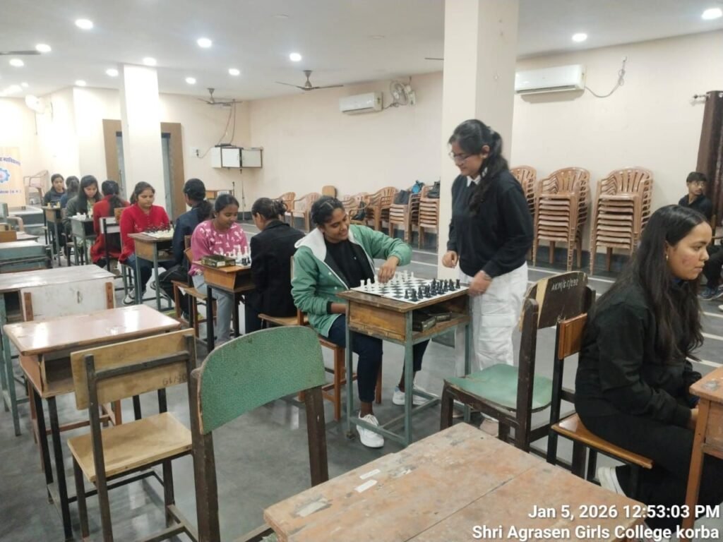 कोरबा, श्री अग्रसेन कन्या महाविद्यालय के प्रांगण में उच्च शिक्षा विभाग के अंतर्गत परिक्षेत्र स्तरीय शतरंज ( महिला पुरुष) प्रतियोगिता का आयोजन 5/01/26 को किया गया इस प्रतियोगिता में शासकीय ईवीपीजी महाविद्यालय कोरबा. कमला नेहरू महाविद्यालय कोरबा. शासकीय ग्राम्य भारतीय महाविद्यालय हरदी बाजार. शासकीय नवीन महाविद्यालय पाली. शासकीय महाविद्यालप दीपका. श्री अग्रसेन कन्या महाविद्यालय कोरबा. शासकीय मिनीमाता कन्या महाविद्यालयकोरबा. की टीमों ने भाग लिया‌